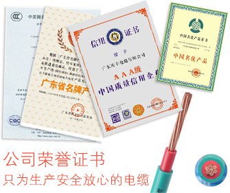 公司先后獲得CCC認證,廣東省名牌,中國名優產品,中國質量信用企業,環境標志產品認證證書,計量體系認證,全國守合同重信用單位,質量管理體系認證,高新技術企業,質量過硬放心品牌,全國消費者信得過產品,阻燃制品標識使用證書,中國綠色環保產品等證書,廣東慶豐電纜為您的安全保駕護航.